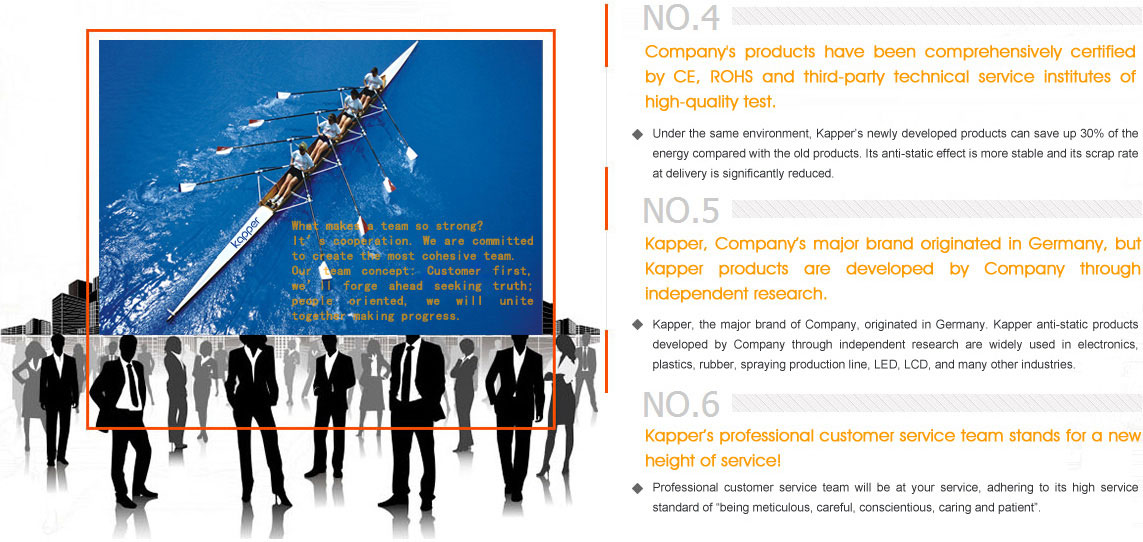Integrating the product researching, developing, producing, marketing, innovating and servicing, as a comprehensive leading enterprise of anti-static technology, Kapper International is the first domestic developer and producer of the remote control intelligent ion fan. Company's products have been certified by CE, ROHS and third-party technical service institutes of high-quality test.Company has obtained over 30 patents including the product design patents......