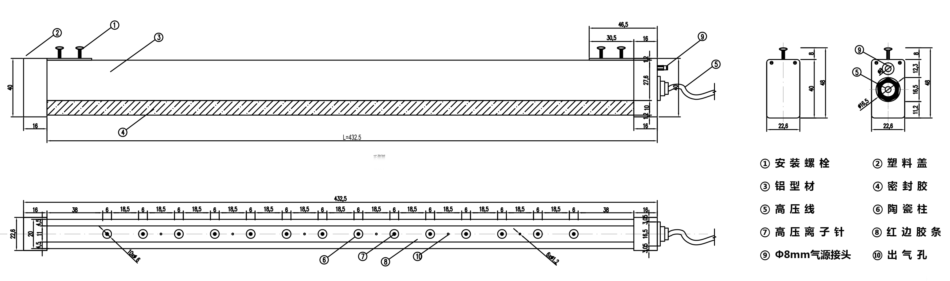 KP506A第4.5代機械與智能型離子風棒是一種可選擇連接或不連接壓縮空氣的除靜電裝置,未連接壓縮空氣的消除靜電距離建議在100mm以內,連接壓縮空氣的消除靜電距離建議在300mm以內。是一種固定式的除靜電設備,需要配壓縮空氣和7.0KV的KP401高壓電源供應器才可使用。長度可以按客戶的要求定做。具有安裝簡易、工作穩定、消除靜電速度快的特點。